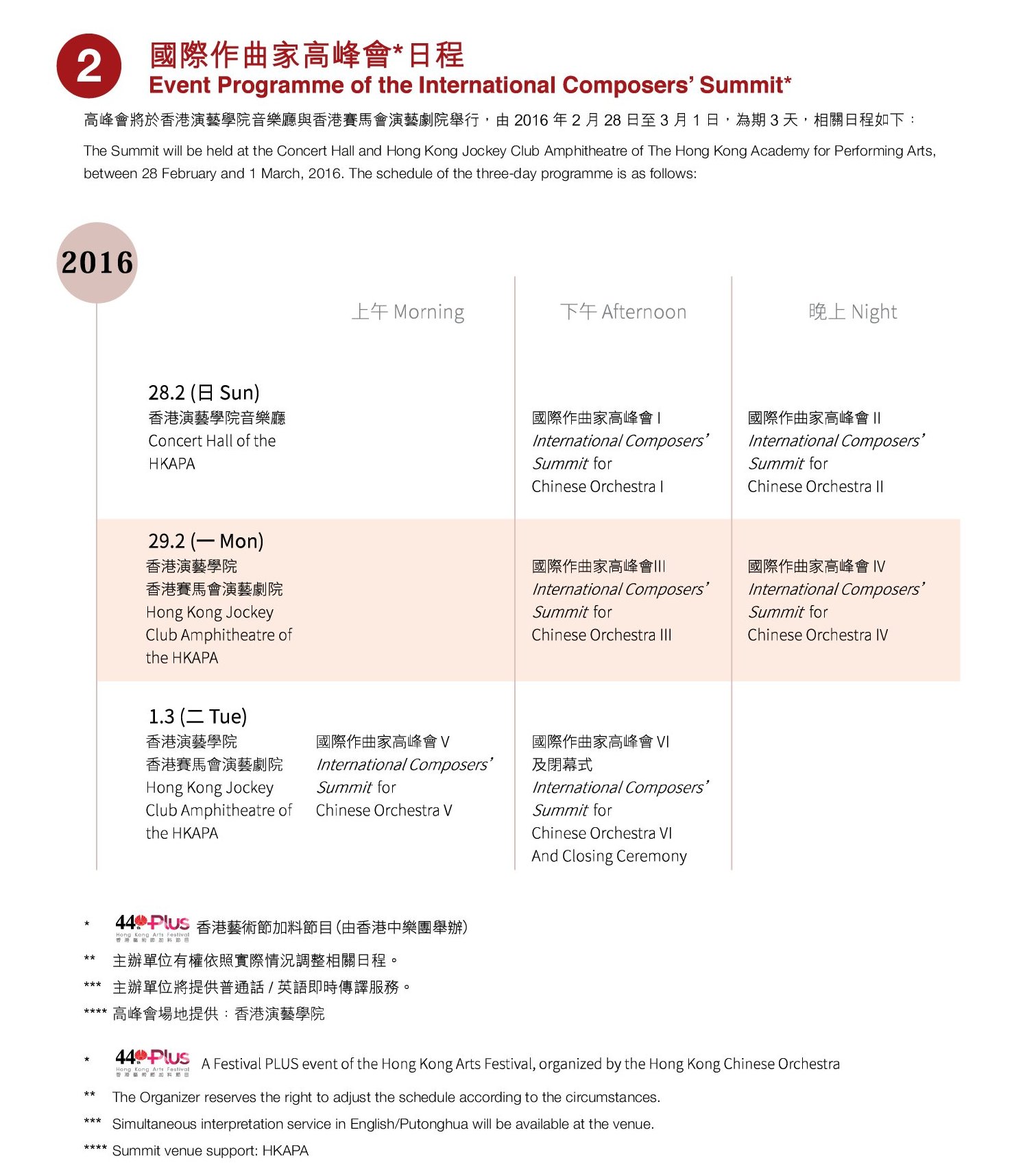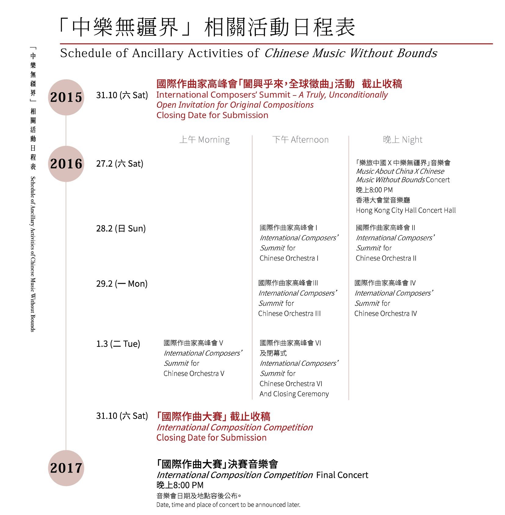 作為享有「香港文化大使」美譽的香港中樂團,我們十分榮幸能為中樂藝術貢獻一份力量,迄今來自歐洲、北美洲、非洲及亞洲等地的作曲家的委約和委編作品已超過 2,300 首。隨着中華文化在國際上的影響力與日俱增,愈來愈多作曲家嘗試以大型中樂的形式來創作他們的作品,因此大型中樂創作的專業知識、經驗分享和深入研討便顯得尤其重要。在這樣一個大環境裡,我們決定以「音樂無疆界」的概念來舉辦 2016 年的「國際作曲家高峰會」及 2017 年的「國際作曲大賽」──前者邀請大型中樂創作中具代表性的華人和非華人作曲家,通過他們的成功作品作為實例,分享其創作心得和配器特色,以及如何透過記譜法、配器法和樂器法讓樂器的音樂和搭配獲得最佳效果,這不論對年輕作曲家或專業作曲家都是彌足珍貴的參考;而作曲大賽則致力培育新血,鼓勵創作,讓海內外的年輕作曲家都有發表作品的機會,體現我們對香港未來的中樂發展的一種承擔。